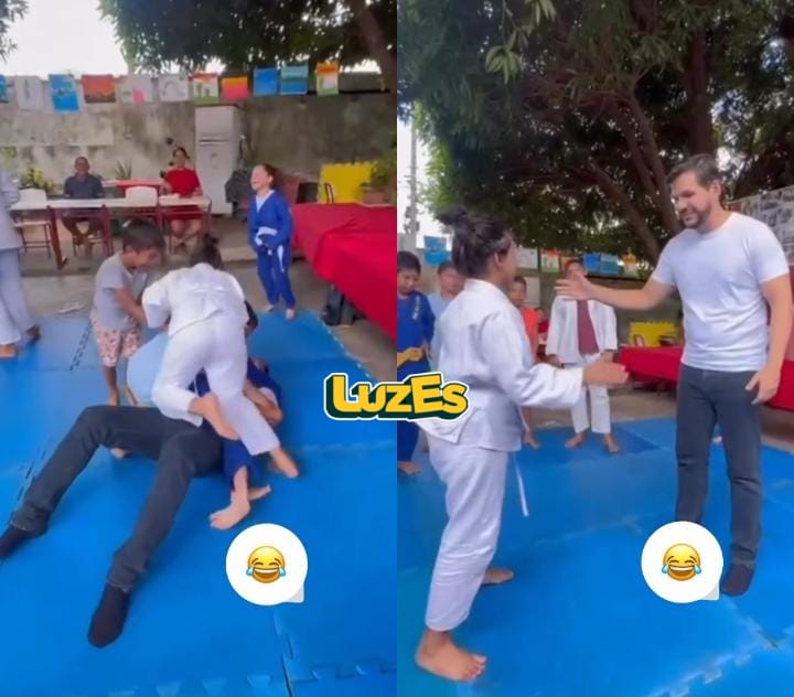 Uma aluna fez uma demonstração de como conseguia derrubar uma pessoa da estatura de Bandeira, que ao permanecer caído, as outras crianças correram e pularam em cima dele fazendo o famoso “montinho”. Foi um momento descontraído e de aproximação com a comunidade.