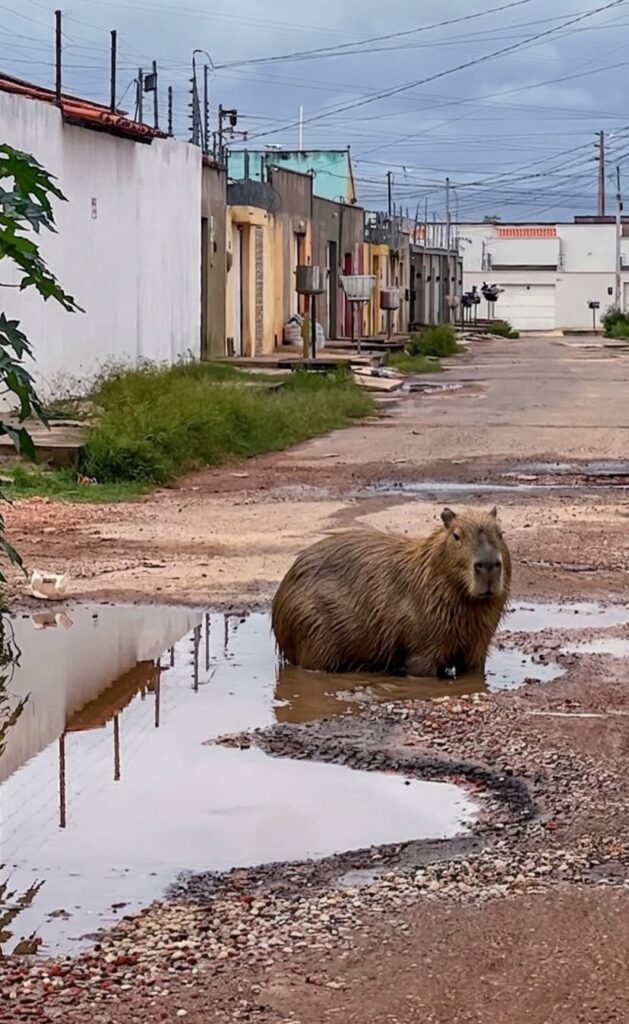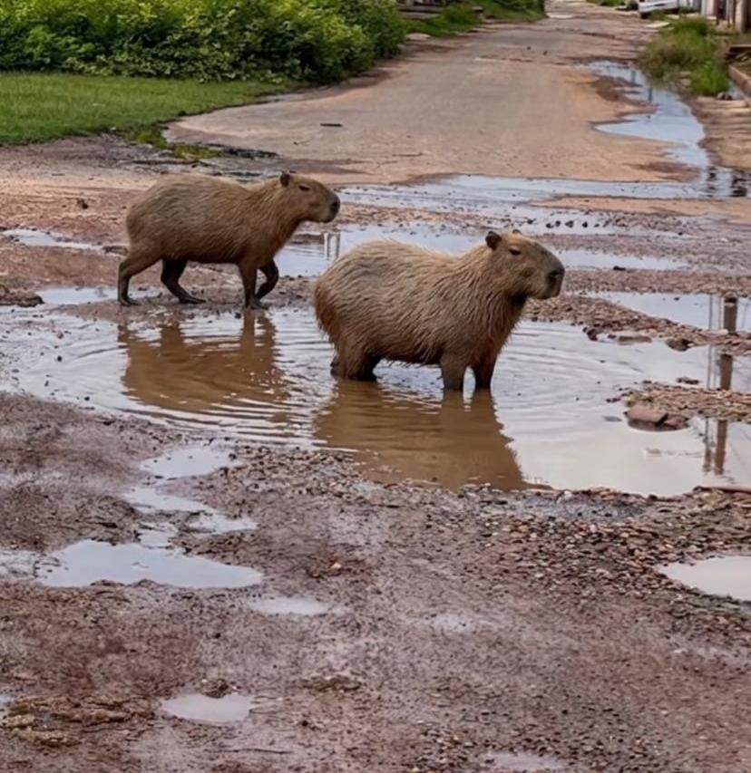 Chegou até nossa Redação de LuzEs imagens de pelo menos duas capivaras se refrescando em poças de lama de ruas esburacadas no município de Timon (MA). A imagem, bonita, a princípio, revela dificuldades enfrentadas pelos moradores no que diz respeito a mobilidade urbana, pois se cabe duas capivaras em um buraco no meio duma rua é porque o acesso e o trânsito de veículos como carros e motos está comprometido.