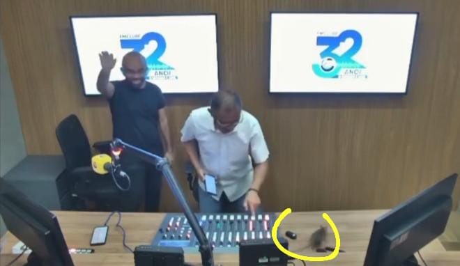A transmissão ao vivo do programa de rádio da FM Clube, em Teresina (PI), flagrou o momento que um ratinho invadiu o estúdio passeando ao lado da mesa de som. O programa vai ao ar semanalmente, das 18h às 19h. No vídeo, 2 radialistas se espantam e se levantam das cadeiras, enquanto a apresentadora se mantém elegante, sentada, corajosa e encerra o bloco.