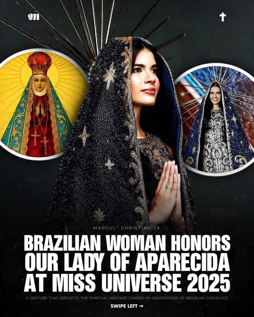 No segmento de traje típico do Miss Universo 2025, a candidata brasileira Maria Gabriela Lacerda escolheu uma homenagem marcante a Nossa Senhora Aparecida, título dado à Virgem Maria venerada como padroeira do Brasil.