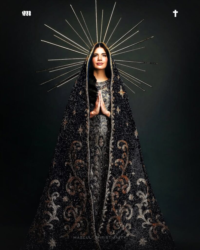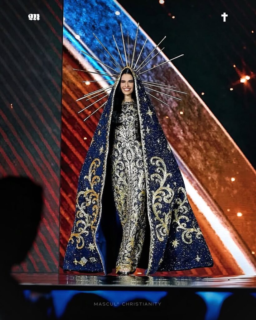 Seu traje elaborado retratava a imagem icônica da Mãe Bendita envolta em um manto azul com detalhes dourados e usando uma coroa, simbolizando a fé, as raízes culturais e a identidade nacional de seu país.