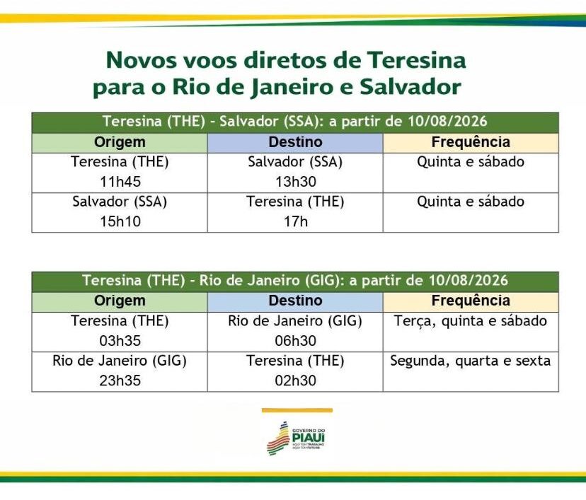 Os voos Teresina – Rio de Janeiro terão três frequências semanais. As saídas da capital do Piauí serão às terças, quintas e sábados, enquanto a volta, a partir do estado carioca, será às segundas, quartas e sextas. Já os voos Teresina – Salvador terão duas frequências semanais de ida e volta, sempre às quintas e sábados.