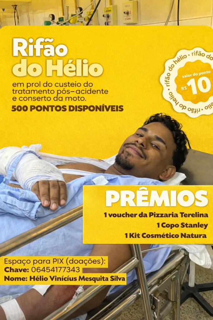 O @helio.mesquita é um dos melhores produtores culturais do Piauí, está no nono ano de Psicologia, mas sofreu um ac1dente de moto e está precisando da nossa ajuda. Botem um ponto na rifa dele ou façam doação de qualquer valor.
