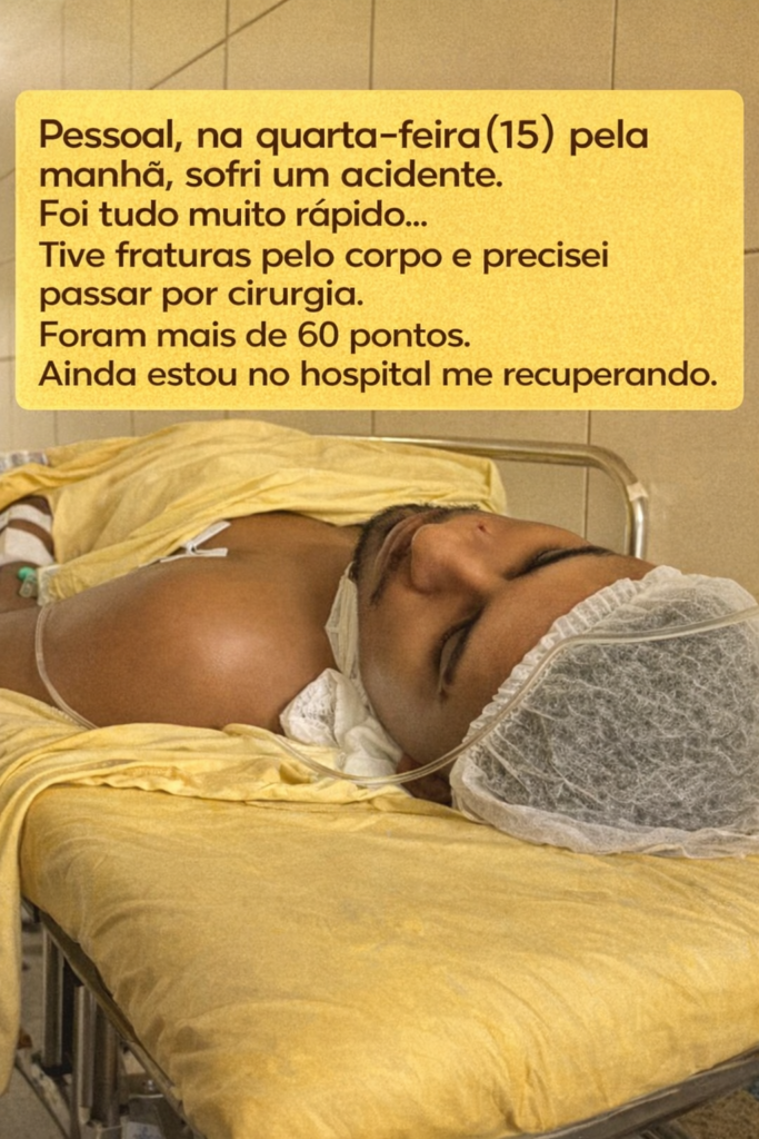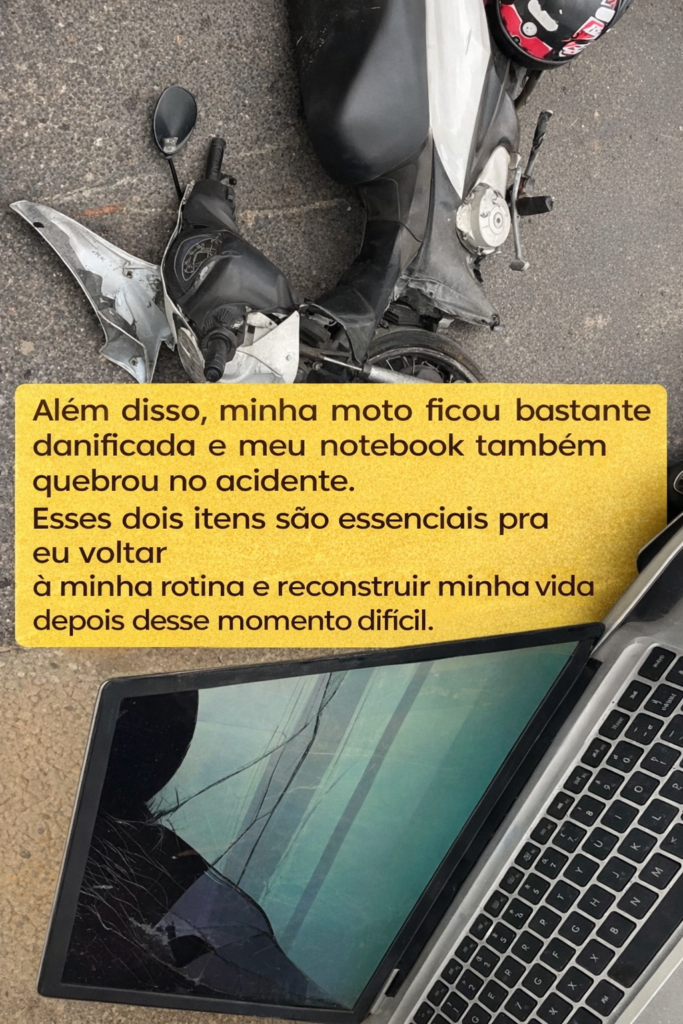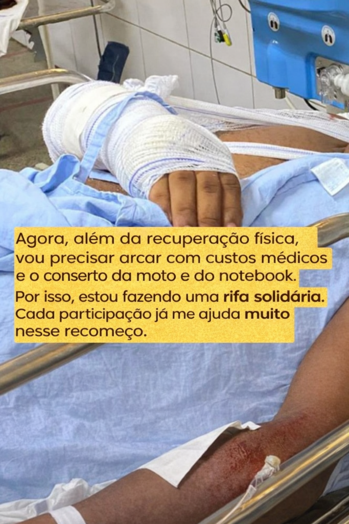Ele perdeu a moto e o notebook, que são materiais de trabalho. Com os ferimentos, acabou pegando 60 pontos na cirurgia. Está precisando muito de todo apoio.