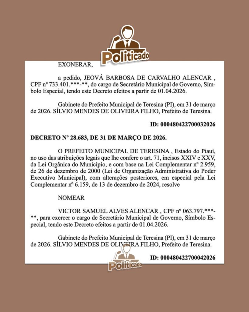 O vice-prefeito de Teresina, Jeová Alencar, pediu afastamento do cargo de secretário Municipal de Governo para disputar as eleições de 2026. Para o seu lugar, o prefeito Silvio Mendes nomeou o vereador Samuel Alencar, filho de Jeová.