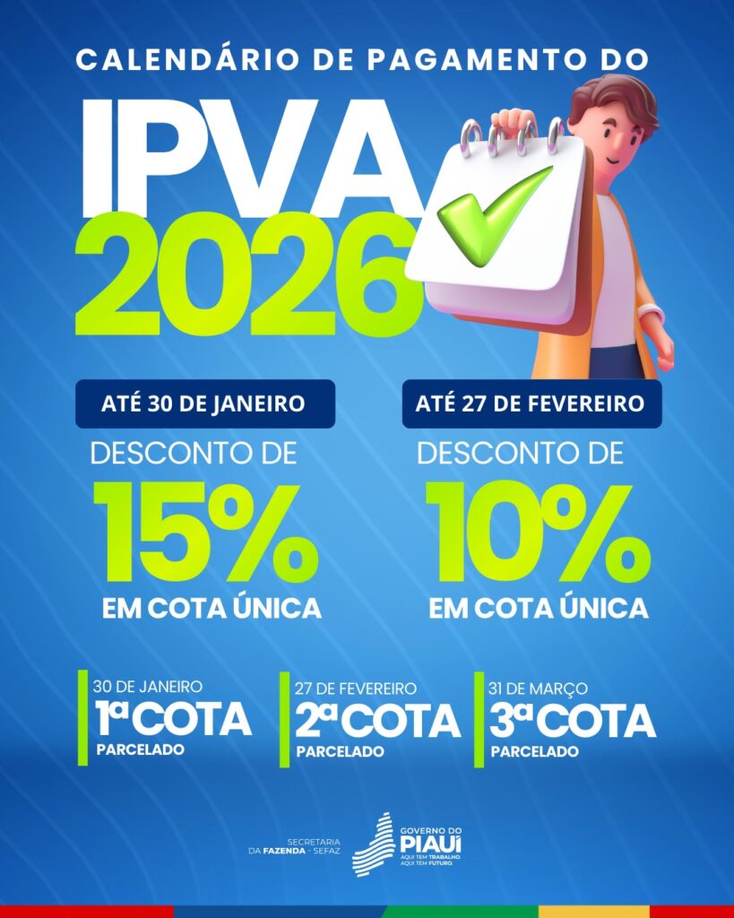 Já é possível realizar o pagamento do Imposto sobre a Propriedade de Veículos Automotores (IPVA) referente ao ano de 2026 no site da Secretaria da Fazenda do Piauí. Os contribuintes que escolherem pagar o IPVA em cota única (à vista) poderão obter dois níveis de desconto: até 30 de janeiro de 2026, com desconto de 15%; e até 27 de fevereiro de 2026, com desconto de 10%. A previsão é de uma arrecadação em torno de R$ 650 milhões.